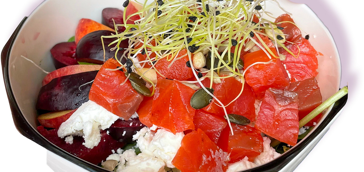 Zur Weinprobe einfach mal probieren - leckeres Roastbeef Sandwich (Roastbeef von der Metzgerei Deininger, Grillgemüse, Babyspinat) oder den Linsen-Lachsforellen Bowl (bunte Linsen, Lachsforelle von der Hagenmühle, Feta, Frühlingszwiebeln, Pfirsich und Pflaume, Babyspinat und Walnusskerne)